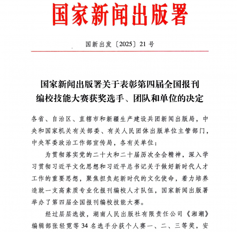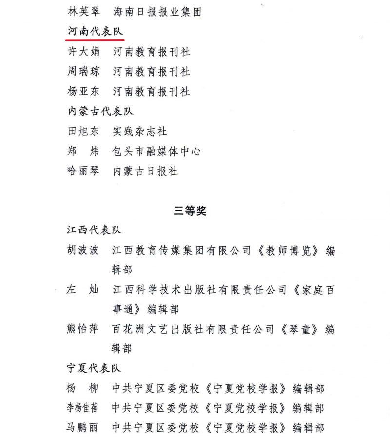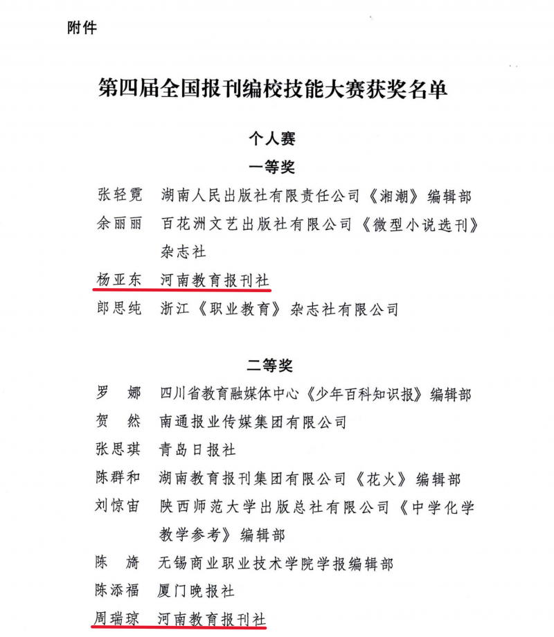 近日,国家新闻出版署公布了第四届全国报刊编校技能大赛获奖名单,代表我省参赛的河南教育报刊社3名选手(杨亚东、周瑞琼、许大娟 )凭借多年深耕编校领域的深厚积淀与扎实功底,在高手如云的角逐中脱颖而出,个人赛和团队赛全部获奖,充分展现了河南教育报刊社的编校实力。