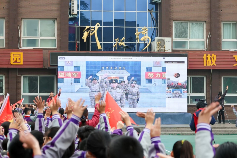 仪式后的互动环节,学生代表深情朗诵《致敬戍边英雄》,真挚的童声穿越屏幕,让高原官兵报以热烈掌声。部队领导通过连线,生动讲述了官兵“缺氧不缺精神”的坚守故事,并勉励同学们珍惜时光,立志成才。随后,全体官兵发出“边防有我在,祖国请放心”的铮铮誓言,这雷霆之声震撼人心,给全体师生带来深刻的精神洗礼。校方代表表示,戍边官兵是新时代最生动的教科书,学校将把这份精神财富融入日常教育。活动尾声,承载着学子敬意的贺卡被现场展示并将寄往边疆,全体师生“致敬英雄,强国有我”的呼喊与边关誓言遥相呼应,完成了这场“校园—军营”双向奔赴的爱国主义教育闭环。