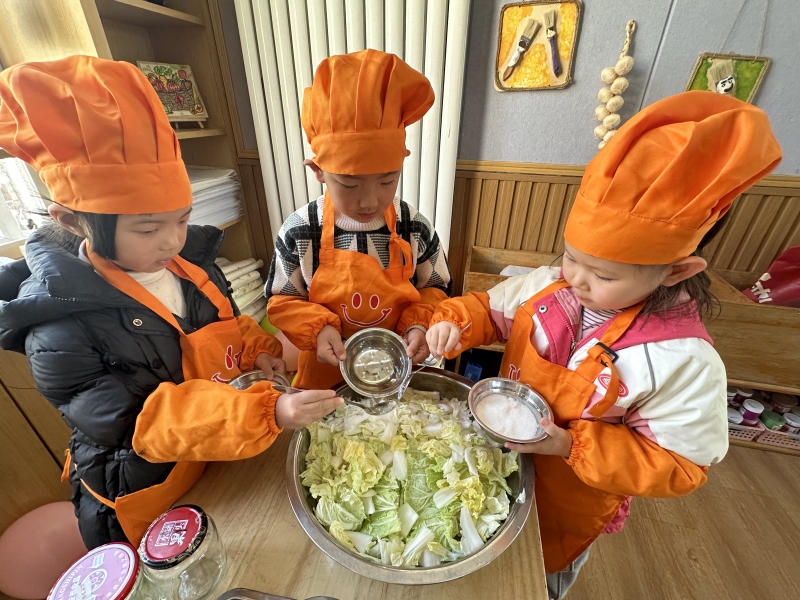随着小雪节气来临,活动转向“冬藏”的智慧。孩子们认真处理白菜与萝卜,学习腌制的方法,将食材一层层放入罐中。他们观察着食材的变化,在等待的过程中,了解保存食物的传统方法,体会时间赋予风味的独特意义。