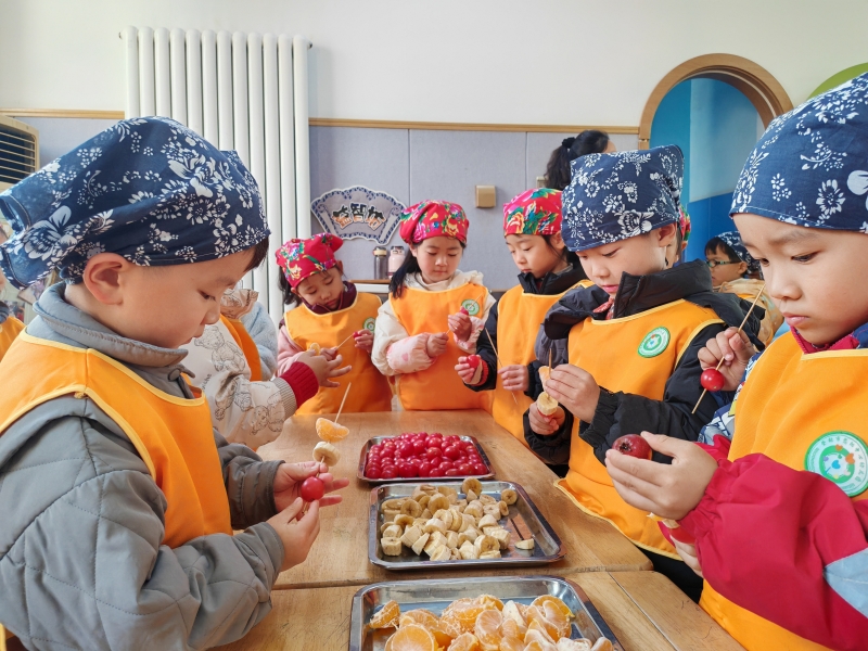 进入大雪时节,活动重点转向“暖身”。孩子们合作熬制暖羹,轻轻搅拌锅中的食材,小心盛起一碗碗冒着热气的汤食。灶台边的专注与分享,让“大雪补暖”不再是书本上的知识,而成为他们手心真实的温度。此外,孩子们还学会了串鲜果、裹糖衣,亲手制作糖葫芦。他们指尖粘糖,笑眼映光,在“裹糖藏甜”的实践中,把大雪节气的暖意,酿成舌尖上的甜蜜。