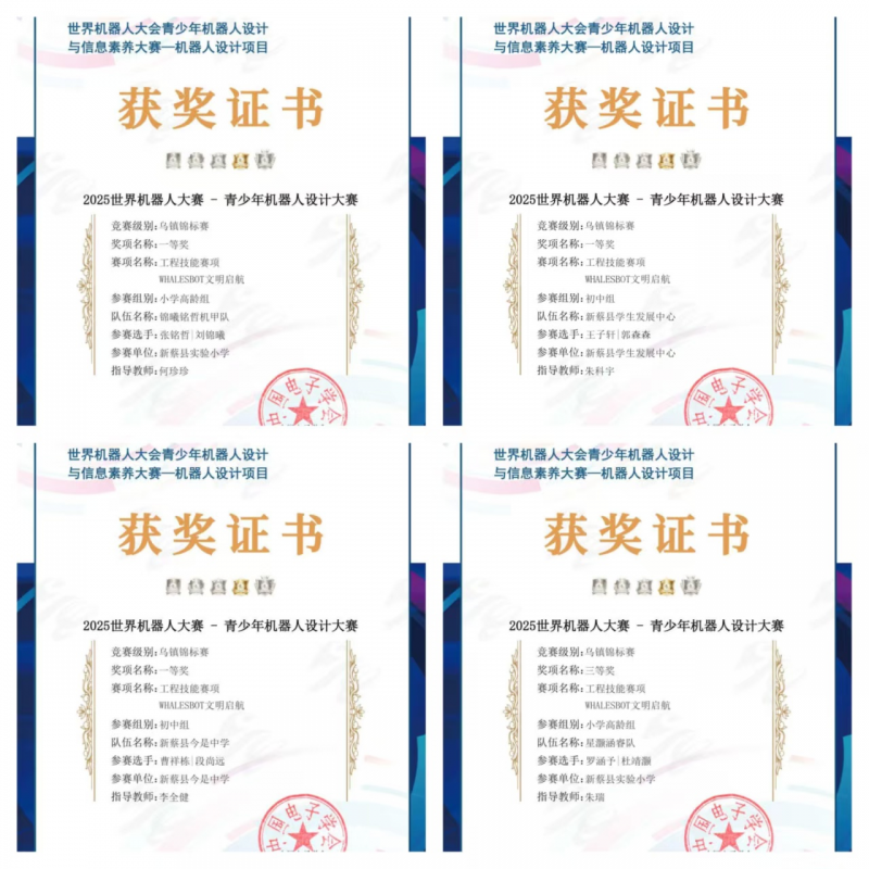 近日,2025年世界机器人大赛总决赛、锦标赛(浙江乌镇)先后圆满落幕,新蔡县学子凭借过硬实力在赛场上脱颖而出,斩获多项大奖,尽显新蔡青少年科技创新硬实力,为全县教育事业赢得荣誉。