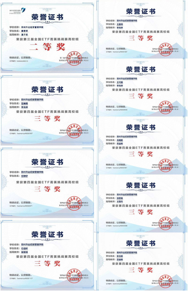 为全面提升金融专业人才质量,培养高素质创新实践技能人才,郑州升达经贸管理学院金融贸易学院积极组织学生参加第四届“全国ETF菁英挑战赛”,21名学生在李光举、柴琳琳、温子奕、苏益莉等教师的精心指导下,凭借出色的投资分析能力和稳健的风险控制策略,最终获得二等奖1项、三等奖8项,充分展现了我校学子扎实的专业功底与出色的实践能力。