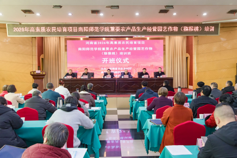 2026年3月9日,由河南省农业农村厅主办、南阳师范学院和南阳市农业农村局共同承办的“河南省2026年高素质农民培育项目——重要农产品生产经营园艺作物(猕猴桃)培训班”开班仪式举行。南阳师院副校长姚伦广,南阳市农业农村局副局长张德,科技教育科科长裴志刚,南阳师院校友办公室主任李红武、水资源与现代农业学院党委书记曹鹏出席仪式。仪式由南阳师院水资源与现代农业学院正处级组织员杨涛主持。