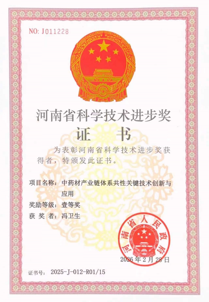 中药是我国具有原创优势的科技资源,如何从种质创制、种植规范、药效物质基础解析、作用机理确证、产地加工炮制一体化等领域突破中药产业关键技术,是长期困扰中药产业发展的核心难题。河南中医药大学药学院冯卫生教授团队在“十五”国家科技攻关计划、“十一五”“十二五”国家科技支撑计划、“十三五”国家重点研发计划、中央引导地方科技发展资金、河南省重大专项等项目的支持下,历经二十五年研究积累,创新性地构建了以地黄、淫羊藿、山药、菊花、牛膝、山茱萸、连翘、冬凌草为主的优良种质创制技术创新、规范化种植技术集成、药效物质基础及作用机制、产地加工炮制一体化及大健康产品研发等关键技术体系,有效突破了制约道地药材产业高质量发展的“卡脖子”问题,形成了道地药材产业高质量发展的新模式,有力促进区域经济发展,为乡村振兴探索一条新途径。团队完成的成果《中药材产业链体系共性关键技术创新与应用》荣获2025年河南省科技进步奖一等奖。