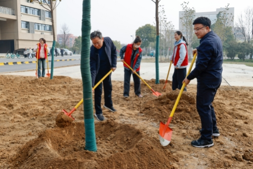 春意勃发、干劲十足。师生们齐心合力、协作默契,校领导和志愿者们一起挥锹铲土、扶苗填坑、提水浇灌,现场种植的数排广玉兰树苗整齐有致,迎风挺立,在三月春风的吹拂下焕发出勃勃生机。