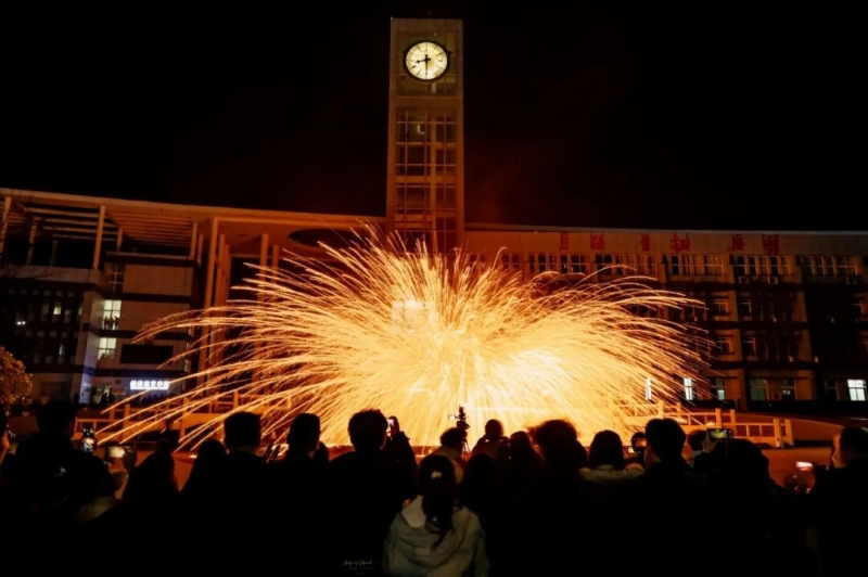 夜幕降临,国家级非物质文化遗产“打铁花”震撼上演,千年非遗点亮新学期夜空。千度铁水划破夜空,瞬间化作漫天金雨,火树银花不夜天的壮美景象,让学子们惊叹连连。这场融合杂技与舞蹈的表演,不仅展现非遗之美,更传递着传承人“台上一分钟,台下十年功”的匠心精神。