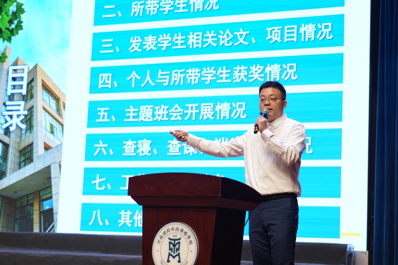 辅导员达标考核涵盖材料审核、工作综述、随抽班会、随机提问四个环节。班会选题紧密结合国家政策、学校发展与学生实际需求,涵盖网络思政教育、心理健康疏导、学业与就业指导、安全教育等主题。辅导员结合自身带班经历,用真实案例讲述育人故事,展现对学生成长的用心用情。