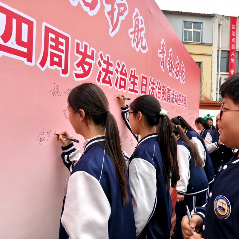 “我将尊法守法,扛起青春担当!”学生代表王锦熙带领全体同学庄严宣誓,誓言铿锵。同学们佩戴法治徽章、领取责任明白卡,在青春门与家长携手同行,于签名墙郑重落笔,许下法治承诺。学生代表张智晴分享成长感悟:“十四岁是责任起点,我会把法治记在心间,走好青春每一步。”家长魏子淳妈妈受访时说:“家校同频才能守好成长关,今后我会更注重家庭法治教育,做好孩子的第一任老师。”