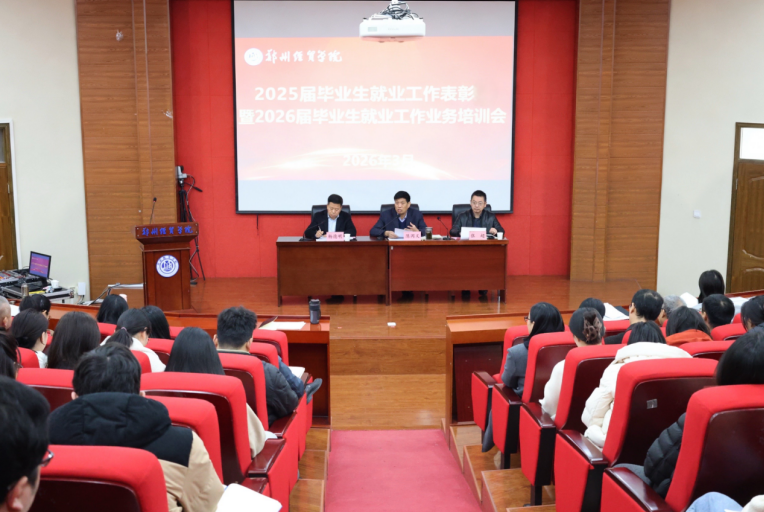 3月19日上午,郑州经贸学院召开2025届毕业生就业工作表彰暨2026年毕业生就业工作业务培训会。学校领导陈丙义、张超、杨德明出席会议,教务工作部、学务工作部、招生就业处负责人,各学院院长、分管学生工作的党委(副)书记、就业工作专员、全体2026届毕业班辅导员以及招生就业处全体人员参加了会议。会议由校纪委书记、工会主席杨德明主持。