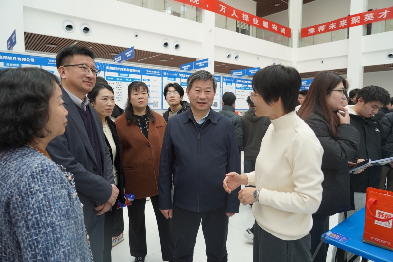 3月22日,河南工业职业技术学院2026年春季双选会举行,学校党委副书记马小兵、副校长朱成俊深入招聘会现场调研指导。本次双选会以“豫荐未来 青春启航”为主题,旨在搭建精准高效的供需对接平台,促进毕业生与用人单位双向选择,全力服务毕业生高质量充分就业。