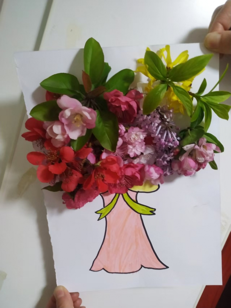 创作环节中,同学们充分发挥想象力,全身心投入创作。有的用花瓣拼贴春日风景画,将粉色花瓣做成桃花、黄色花瓣拼成迎春花,搭配嫩绿的枝叶,勾勒出春意盎然的田园与校园景色;有的制作干花书签,把形态完整的花瓣平整地压在卡纸中,搭配丝带、彩笔装饰,做成独一无二的春日书签;还有的制作花环、花束,将细碎的小花和枝叶编织成漂亮的花环戴在头上,或是扎成小巧的花束,送给身边的老师和同学。通过搭配色彩、设计造型,原本普通的花草,在同学们的巧手下变成了一幅幅创意十足的花瓣画。