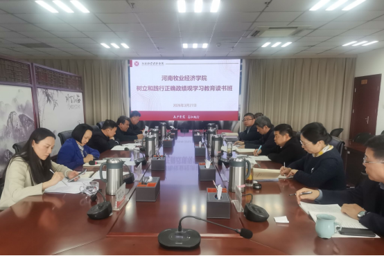 尹新明领学了《习近平关于树立和践行正确政绩观论述摘编》第一章、《习近平总书记地方工作期间坚持正确政绩观生动实践》(习近平同志在浙江省委党校2004年秋季开学典礼上的讲话摘编),大家集体观看了警示教育片《为民造福是最大政绩——领导干部政绩观教育案例警示录》,河南牧业经济学院领导班子成员作交流发言。