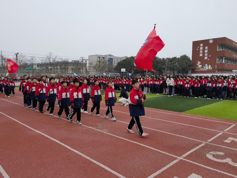开幕式上,各班队伍整齐列队,红蓝校服相映成趣,嘹亮口号响彻校园,逐梦队、向阳队、飞跃队······各班队旗迎风舒展,尽显少年蓬勃朝气。随着校长朱晋广一脚开球,比赛正式打响,足球在绿茵场上划出活力弧线,瞬间点燃全场热情。