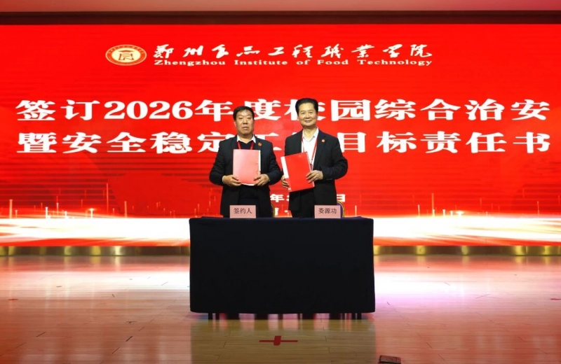 党委副书记张琪传达了省教育厅校园安全系列提示函精神,结合学校实际,就筑牢校园安全防线、压实各级安全管理责任、全面排查整治各类安全风险隐患作出具体部署、提出明确要求,为后续工作开展划定路径、明确方向。 娄源功先后与分管领导签订2026年校园综合治安暨安全稳定工作目标责任书。各分管领导郑重表态,将严格恪守责任书各项要求,扛牢校园安全主体责任,抓实抓细校园安全管理各项工作,全力守护校园和谐稳定,为全体师生营造安全、有序、和谐的学习生活环境。 张琪依次与党委委员、纪委委员签订2026年度全面从严治党责任书。签约双方郑重约定,将以高度的政治自觉带头落实全面从严治党各项要求,带头深学细悟党的创新理论,带头严守党的纪律规矩,以务实作风、有力举措践行初心使命,切实把管党治党责任落到实处。 此次签订仪式的顺利举行,不仅明确了各级岗位职责、压实了工作责任,更凝聚了郑州食品工程职业学院全校上下齐抓共管、共筑安全的强大合力,为学校持续健康发展指明了方向、注入了动力。