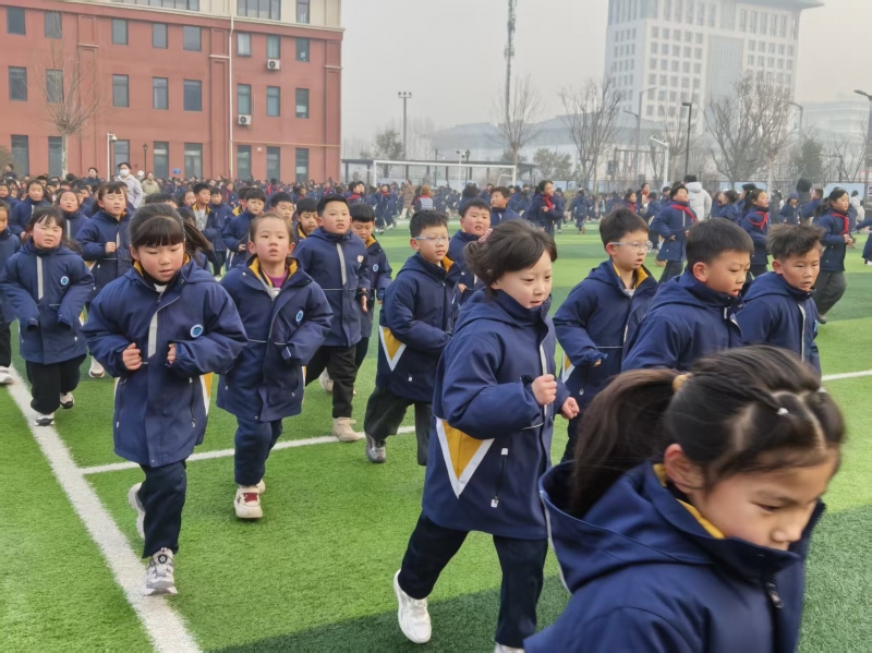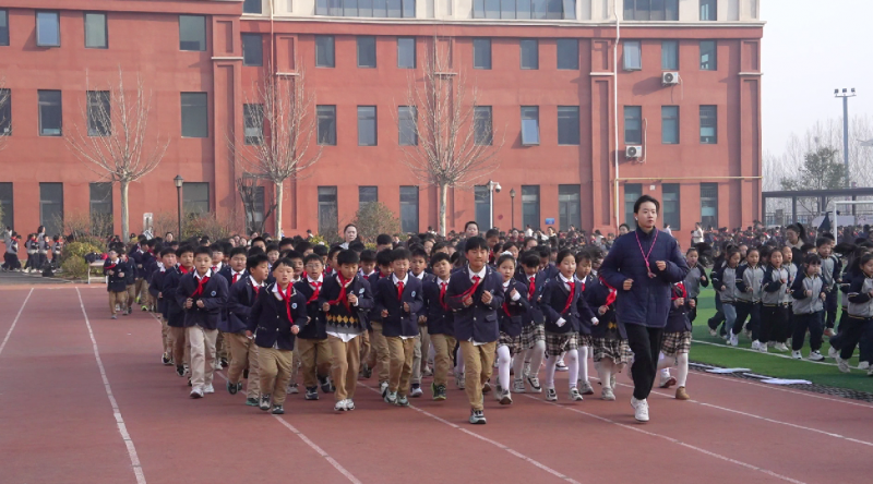 每日清晨,铃声响起,全校师生整齐列队步入操场,在“乐跃晨光”中开启一日校园生活。这是一节“学习准备型体育课”,师生首先以“乐活体能操”舒展身体、激活心肺;随后分两段进行两公里耐力跑,配以节奏音乐,体育教师轮值播报“今日晨语”,将激励语与运动生理知识,师生齐喊校级、班级口号融入其中,凝聚集体向心力;跑步完毕统一放松拉伸,科学调控恢复状态。
