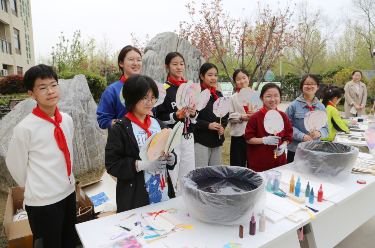 许昌市许都路小学的学生在展示非遗手工漆扇