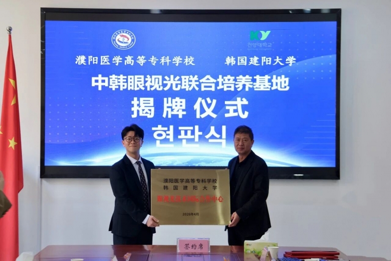 签约仪式上,王庆志和李美香分别代表两校签署了《校际合作谅解备忘录》(MOU),明确了双方合作的核心方向与长效机制。同时,双方共同为“濮阳医学高等专科学校—韩国建阳大学眼视光技术国际合作中心”揭牌,标志着两校在眼视光技术专业领域的合作正式落地,为后续务实合作奠定了坚实基础。