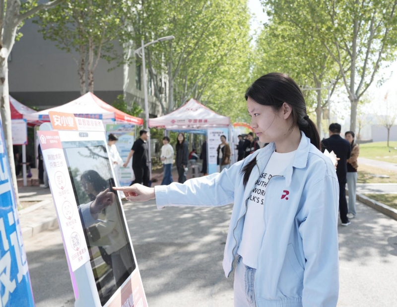 展位旁的一台“速聘求职机”格外引人注目,吸引了众多毕业生纷纷驻足体验、排队尝试。大家只需刷脸完成认证,系统就能自动生成简历并快速投递,最快15秒即可完成操作,求职结果还会同步以短信形式告知,便捷高效的操作让同学们连连称赞。借助大数据与人工智能技术,设备还能智能匹配岗位、靶向推送意向职位,极大简化了求职流程。